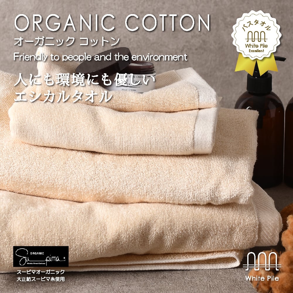 農薬、化学肥料を使用しない有機(オーガニック)栽培で収穫されたコットンだけを原料に、タオルの産地 ”今治” で生産された高い品質のタオルです。有害性のある物質を徹底して排除した素材は、自然環境に優しく、人の健康面からも安心してご使用いただけます。