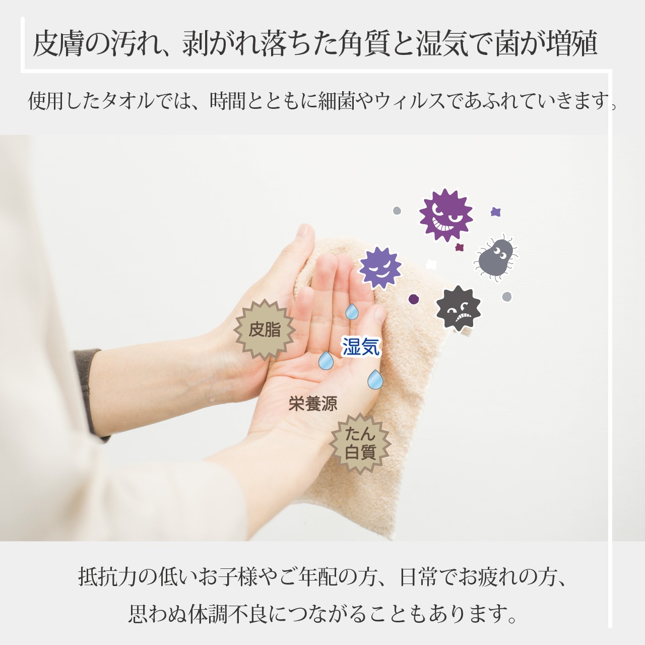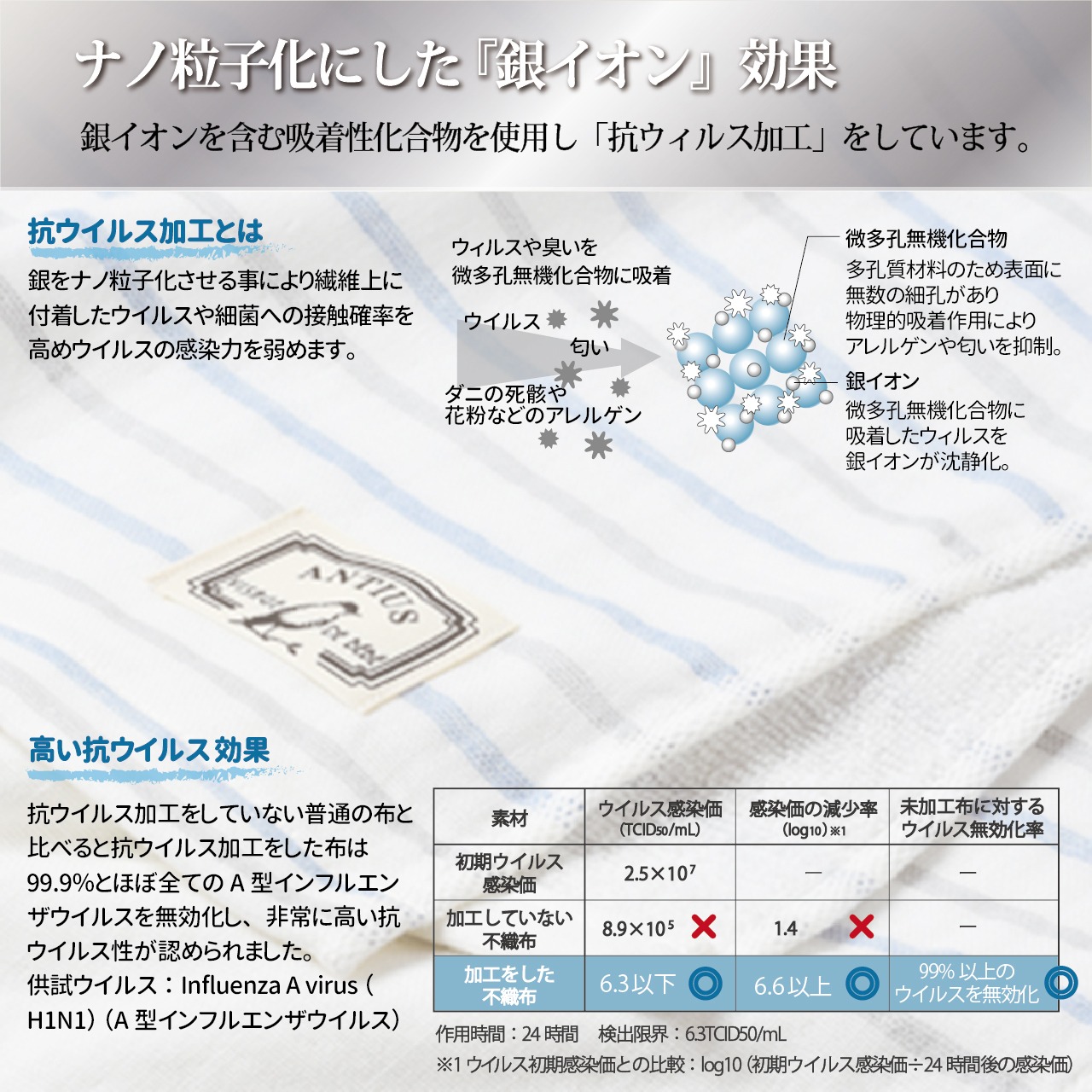 銀を繊維上に付着させる「抗ウィルス加工」を施し、タオルに付着したウィルスの感染力を不活化(無効化)させる機能性タオルです。臭い成分やアレルゲン(ダニの死骸や花粉など)を吸着する効果もあります。